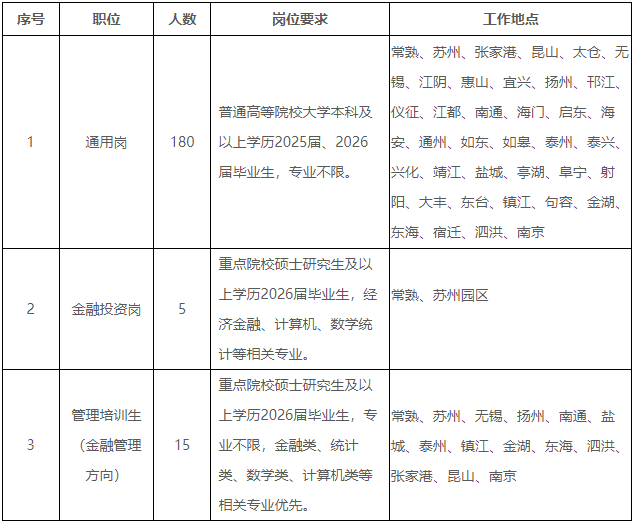 鼎力同行,信步未来!常熟农商银行2026年度校园招聘正式开启,200个岗位虚位以待,现诚邀境内外高等院校优秀青年学子加盟,期待与您同发展,共成长!