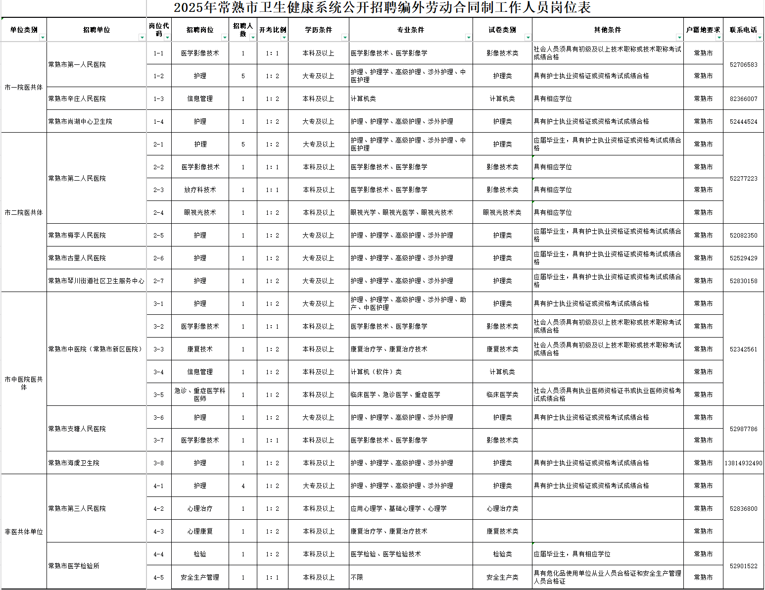 招聘岗位及条件等详见《2025年常熟市卫生健康系统公开招聘编外劳动合同制工作人员岗位表》(见附件)。