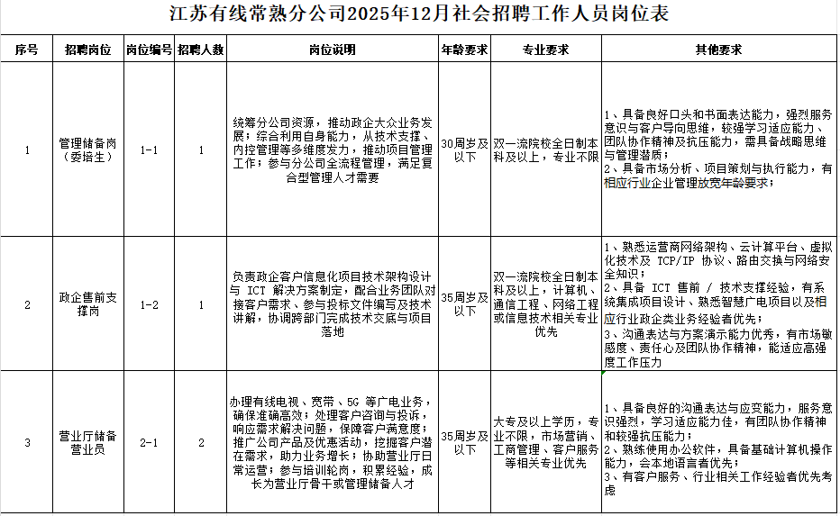 招聘岗位及条件等详见《江苏有线常熟分公司2025年12月社会招聘工作人员岗位表》(附件1)。