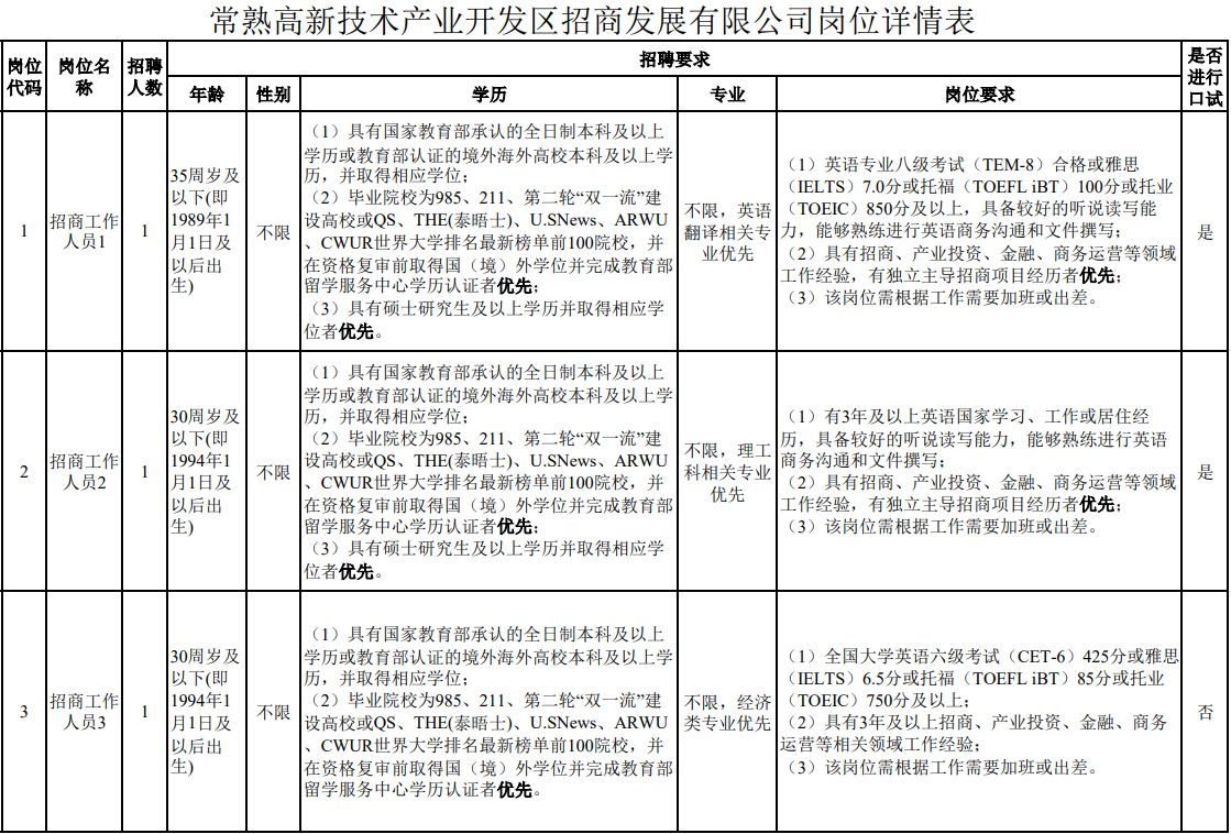 详见《常熟高新技术产业开发区招商发展有限公司岗位简介表》(附件1)。