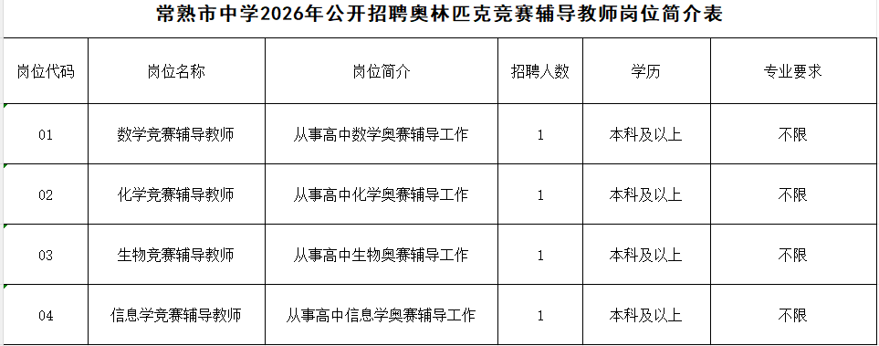 奥林匹克竞赛辅导教师4名,详见《常熟市中学2026年公开招聘奥林匹克竞赛辅导教师岗位简介表》(附件1)。
