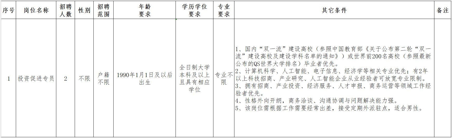 附件1:常熟经济技术开发区科技招商发展有限公司2026年公开招聘投资促进专员岗位情况表
