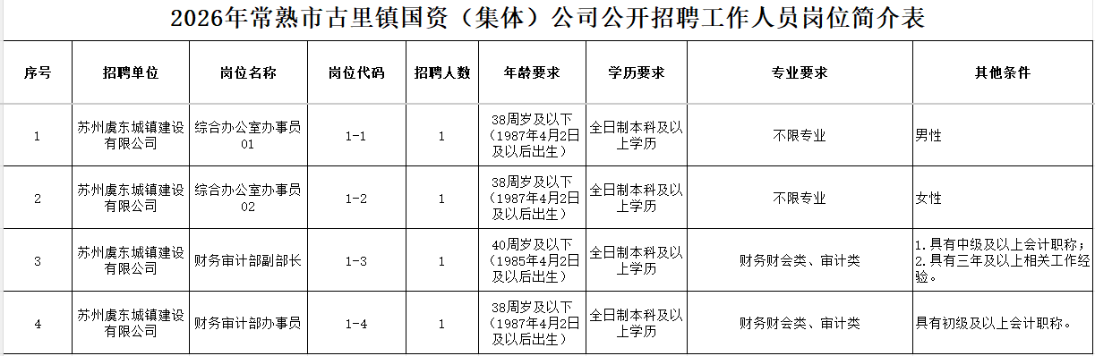 详见《2026年常熟市古里镇国资(集体)公司公开招聘工作人员岗位简介表》(附件1)。